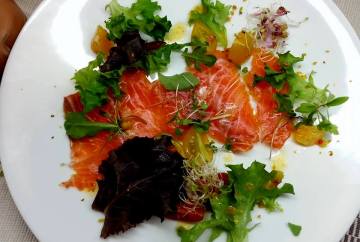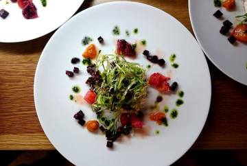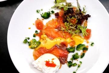 Welcome cocktail (with a non-alcoholic alternative) Starter Citrus salmon with broccoli, poached egg and hollandaise sauce with soft tomato and tobiko Main course Marinated butcher’s steak ssäm Sides of: Kimchi, Wild rice with marinated mushrooms and Thai beetroot salad Dessert Yuzu Meringue Pie with Raspberry Sorbet Coffee,Tea and Infusions, Petit-Four and Home-made liqueurs