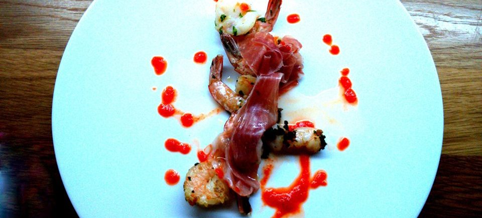Grilled langoustine tail in parsley and garlic with Serrano jam and roasted red pepper caramel