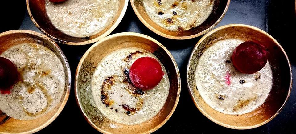Roasted black sesame creme brûlée with raspberry yuzu ice cream