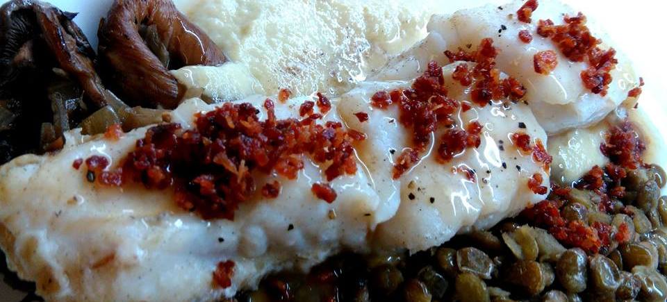Roasted fish with celery pureé and lentils with mushrooms madeira sauce